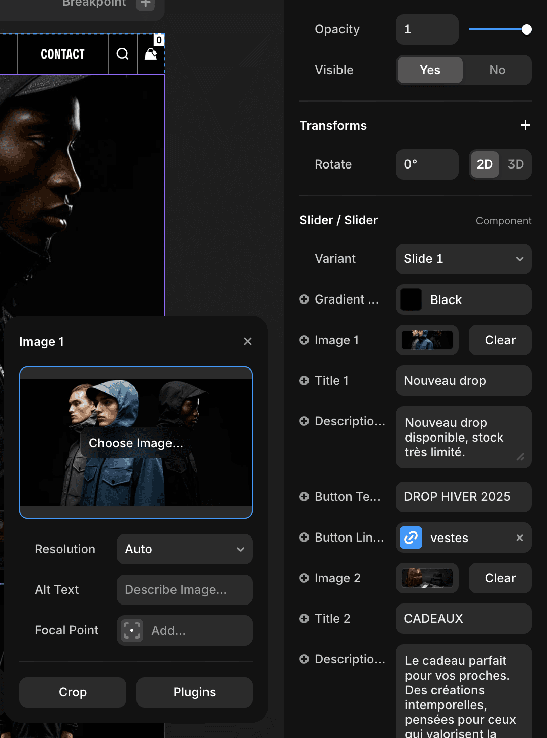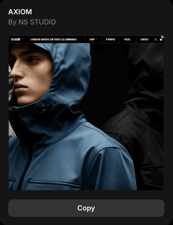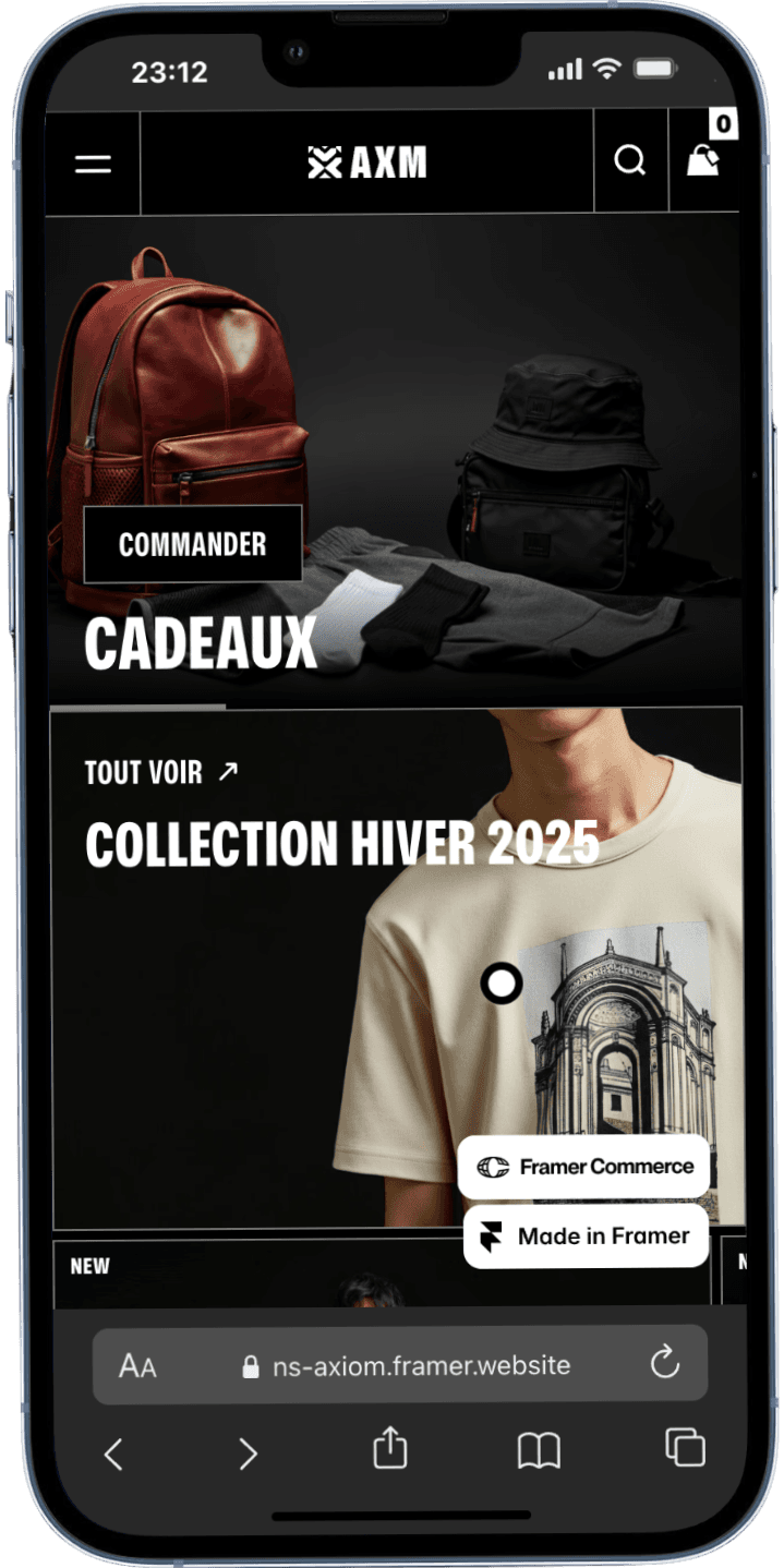 Un site Framer qu'on a déjà designé, connecté à Shopify, que tu peux modifier en quelques clics.